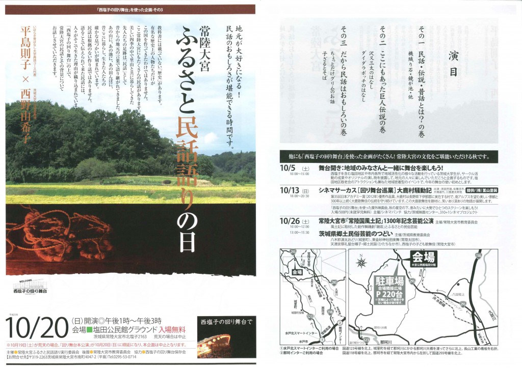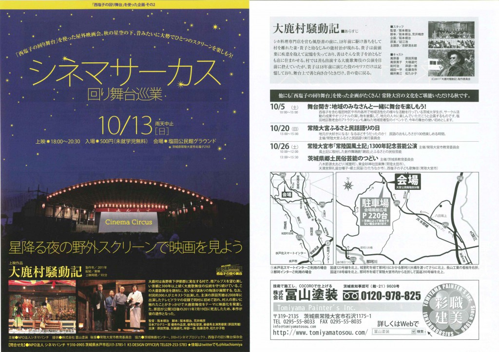 画像をクリックすると大きな画像が表示されます. 10月13日 シネマサーカス 野外映画上映のお知らせ 10月20日 ふるさと民話語りの日のお知らせ 人気記事一覧 予定通り公演を実施します。 10月26日開催のイベントついて 平成25年公演ポスター 地芝居ポータルブログに西塩子の回り舞台レポートが掲載されました。 10/13 シネマサーカス 10/20 ふるさと民話語りの日 のお知らせ
