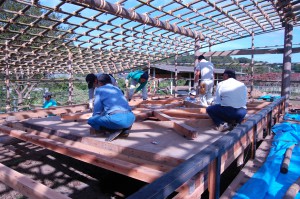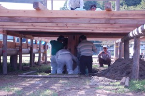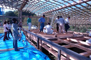 昨日、平舞台と花道の床が完成したので、問題の回り舞台部分の組立てに着手。今までも、頭をひねりつつ、2・3回やり直ししながら組んでいましたが、今年は何と1回で決まったか?!でも、何となく奈落の心棒が曲がっているように見えるのは気のせいですか?