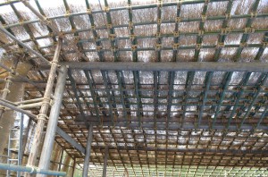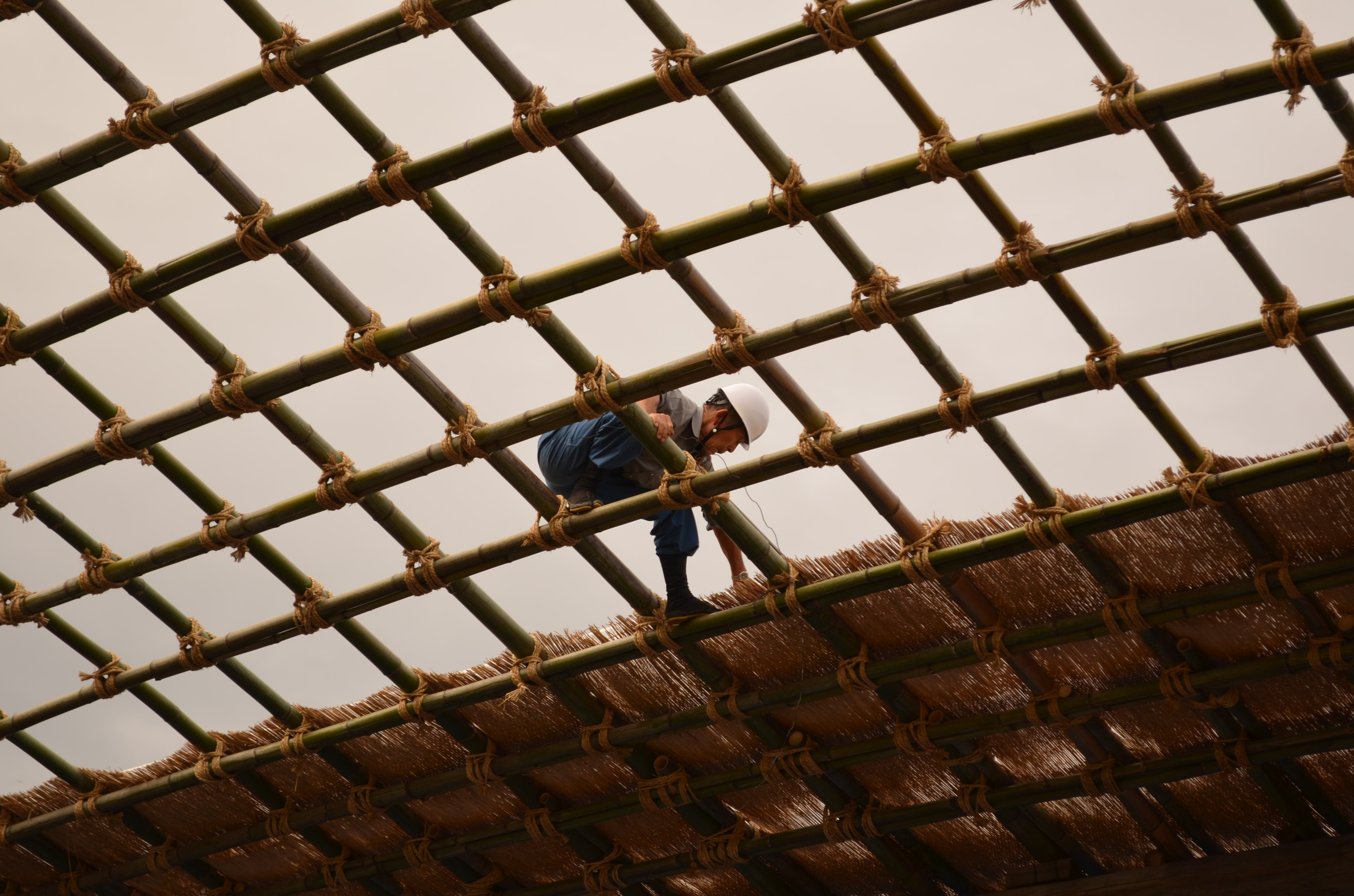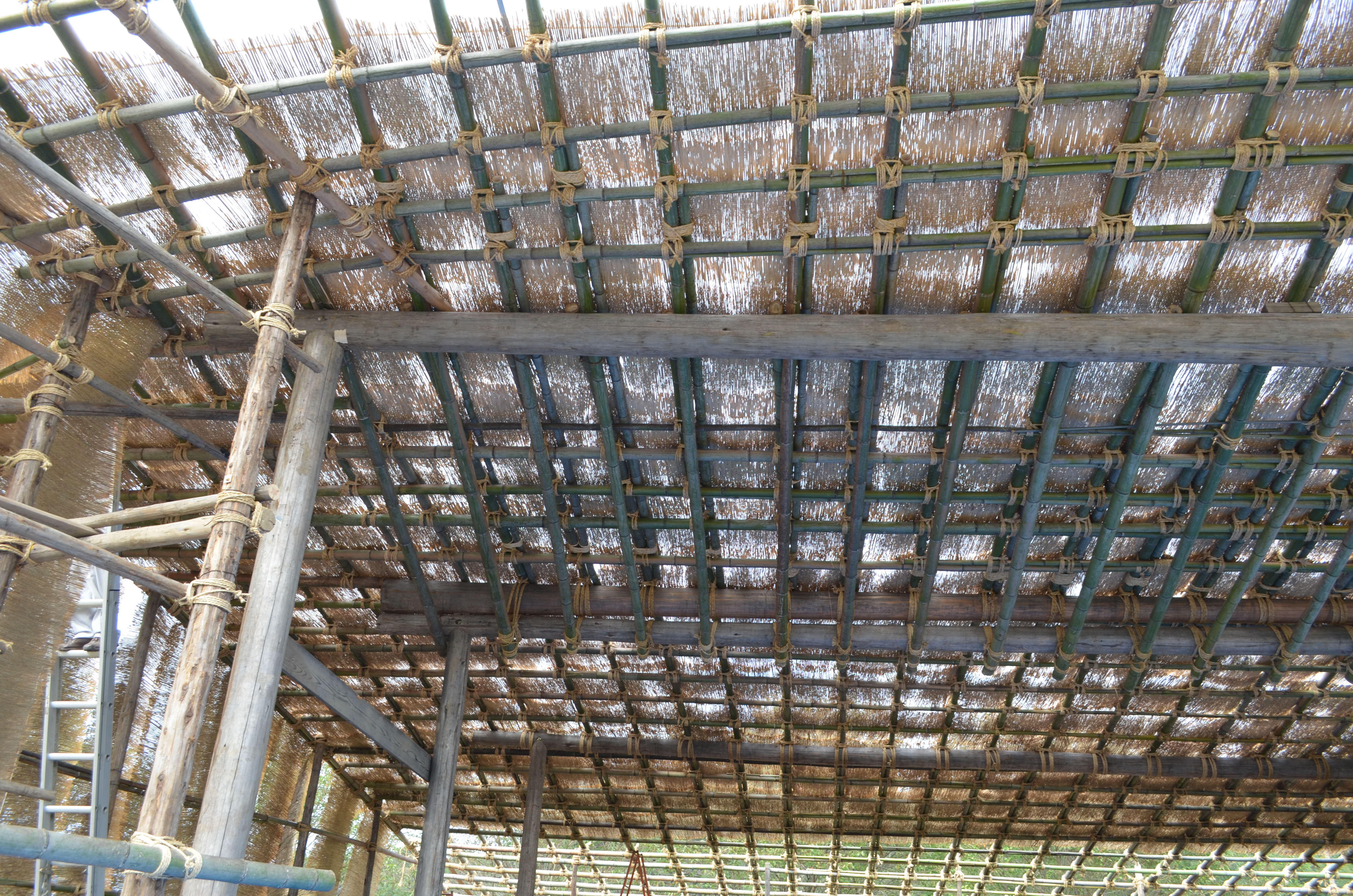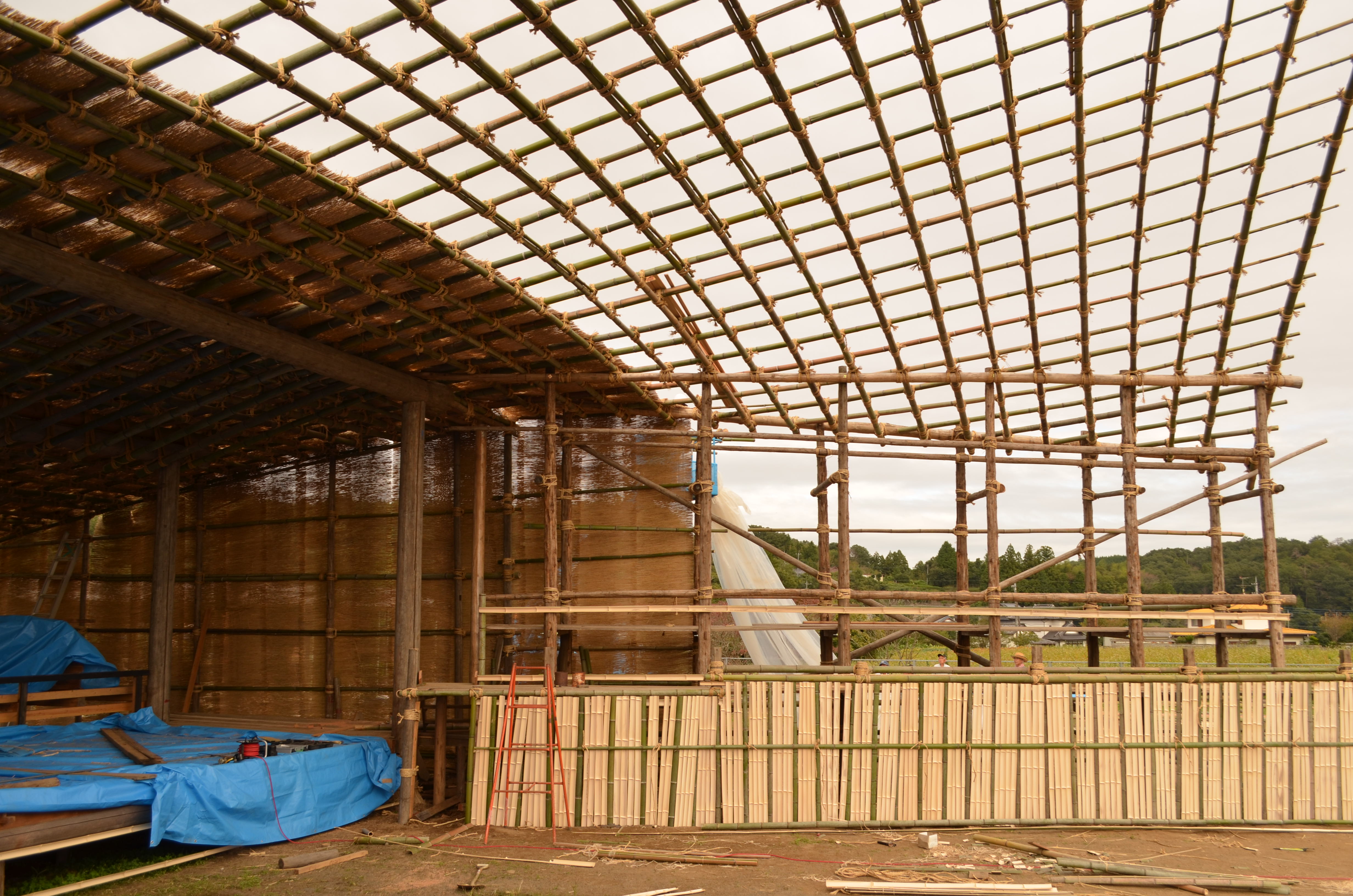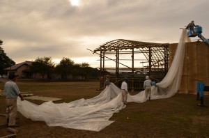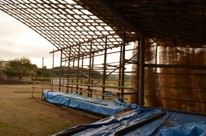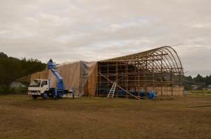 床が雨で濡れないように、急いで菰の上に農業用ハウスの巨大なビニールをかけてゆきます。